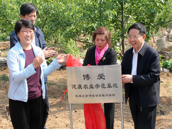 民革中央副主席 、 全国政协常委 、 民革北京市委主委傅惠民 ( 右一) ) 、 北京市门头沟区政协主席张冰(左一) )晨 、民革北京市委秘书长蒋耘晨 (左二) )云 、民革北京市委经社处处长常桂云 ( 右二) ) ,为北京市门头沟 区 军庄镇东山村 “ 博爱 · 健康农业 ”